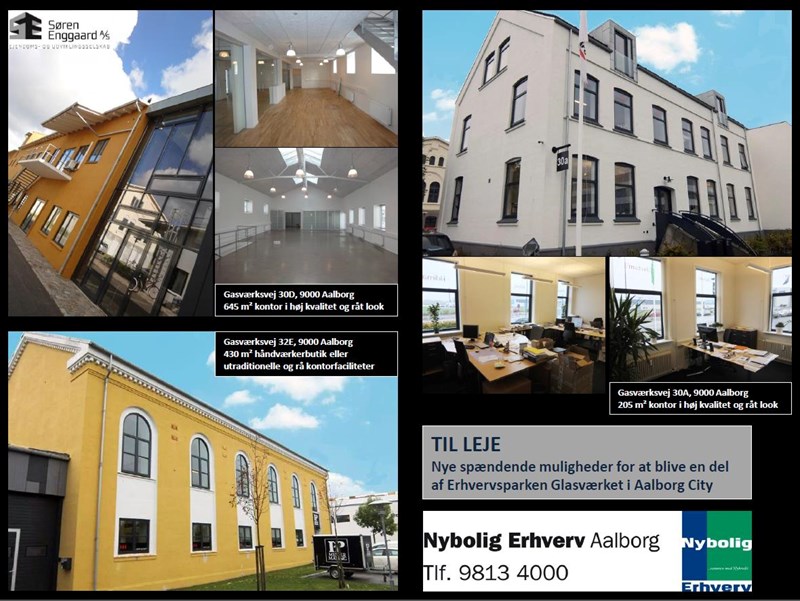 Søren Enggaard A/S præsenterer her nye spændende kontorlejemål i høj kvalitet og charmerende stil i erhvervsparken Glasværket på Gasværksvej tæt ved havnefronten og Aalborg City og alligevel med en optimal placering tæt ved motorvejs til- og frakørslen. Attraktive og fleksible lejevilkår. Se flere detaljer og billeder om lejemålene her: http://www.soren-enggaard.dk/sorenenggaard_v2/Udlejning/Kontor.aspx